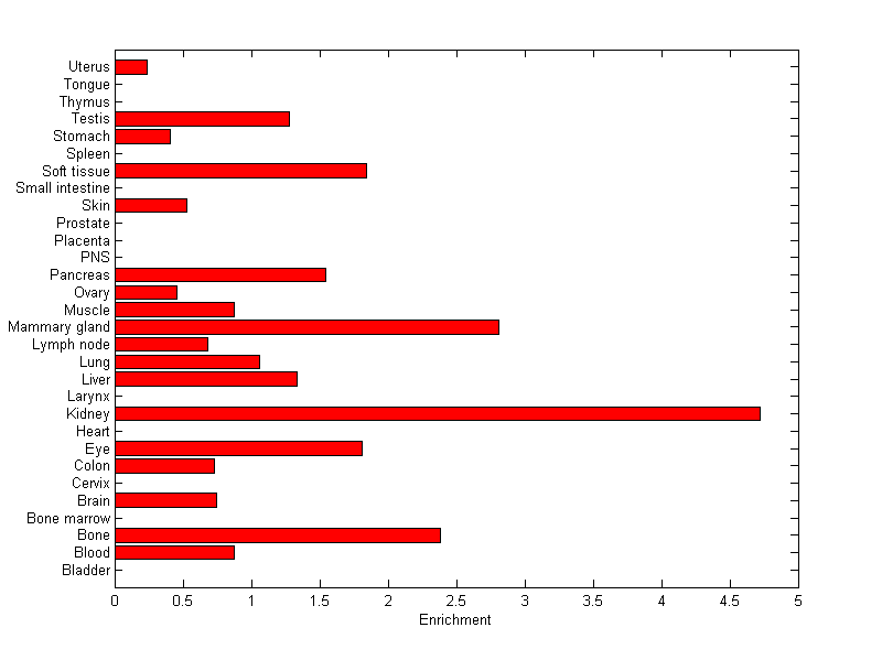 The expression level is normalized with tissue-library size. Each value for a gene in a tissue is a ratio of observed ESTs to the expected one in this tissue. The expected number of ESTs is the product of total ESTs of the gene and the fraction of total ESTs in the tissue among all ESTs in 30 tissues.