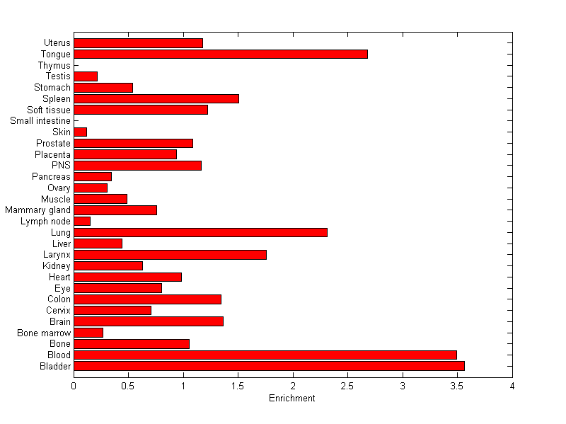 The expression level is normalized with tissue-library size. Each value for a gene in a tissue is a ratio of observed ESTs to the expected one in this tissue. The expected number of ESTs is the product of total ESTs of the gene and the fraction of total ESTs in the tissue among all ESTs in 30 tissues.