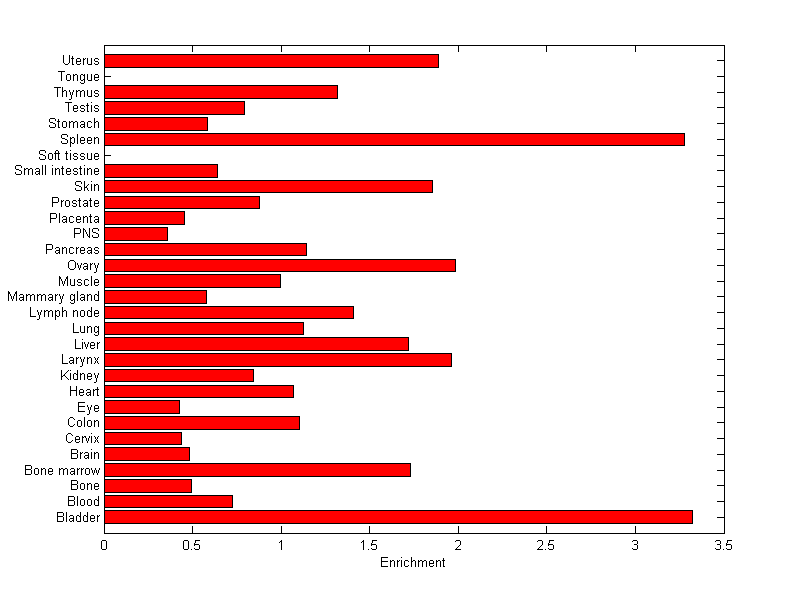 The expression level is normalized with tissue-library size. Each value for a gene in a tissue is a ratio of observed ESTs to the expected one in this tissue. The expected number of ESTs is the product of total ESTs of the gene and the fraction of total ESTs in the tissue among all ESTs in 30 tissues.