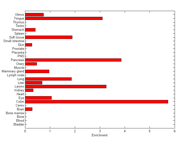 The expression level is normalized with tissue-library size. Each value for a gene in a tissue is a ratio of observed ESTs to the expected one in this tissue. The expected number of ESTs is the product of total ESTs of the gene and the fraction of total ESTs in the tissue among all ESTs in 30 tissues.