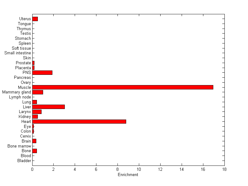 About the profile: The expression level is normalized with tissue-library size. Each value for a gene in a tissue is a ratio of observed ESTs to the expected one in this tissue. The expected number of ESTs is the product of total ESTs of the gene and the fraction of total ESTs in the tissue among all ESTs in 30 tissues. Summary: This gene is preferentially expressed in [heart, muscle] Download: |