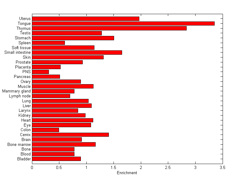 The expression level is normalized with tissue-library size. Each value for a gene in a tissue is a ratio of observed ESTs to the expected one in this tissue. The expected number of ESTs is the product of total ESTs of the gene and the fraction of total ESTs in the tissue among all ESTs in 30 tissues.