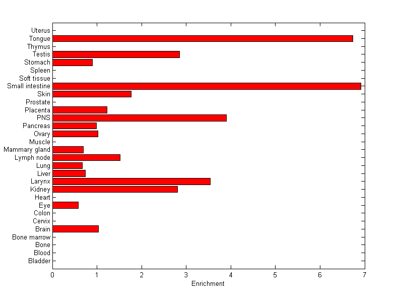 The expression level is normalized with tissue-library size. Each value for a gene in a tissue is a ratio of observed ESTs to the expected one in this tissue. The expected number of ESTs is the product of total ESTs of the gene and the fraction of total ESTs in the tissue among all ESTs in 30 tissues.