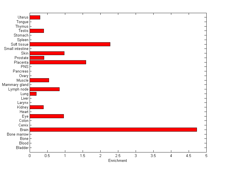 The expression level is normalized with tissue-library size. Each value for a gene in a tissue is a ratio of observed ESTs to the expected one in this tissue. The expected number of ESTs is the product of total ESTs of the gene and the fraction of total ESTs in the tissue among all ESTs in 30 tissues.