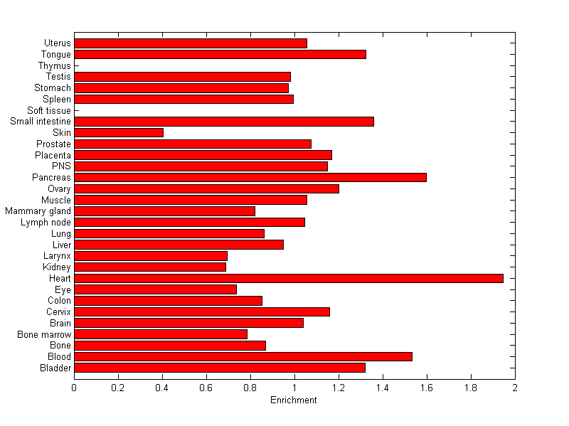 The expression level is normalized with tissue-library size. Each value for a gene in a tissue is a ratio of observed ESTs to the expected one in this tissue. The expected number of ESTs is the product of total ESTs of the gene and the fraction of total ESTs in the tissue among all ESTs in 30 tissues.