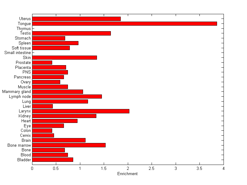 The expression level is normalized with tissue-library size. Each value for a gene in a tissue is a ratio of observed ESTs to the expected one in this tissue. The expected number of ESTs is the product of total ESTs of the gene and the fraction of total ESTs in the tissue among all ESTs in 30 tissues.