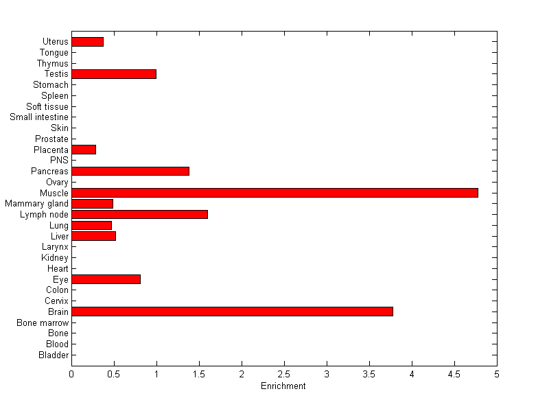 The expression level is normalized with tissue-library size. Each value for a gene in a tissue is a ratio of observed ESTs to the expected one in this tissue. The expected number of ESTs is the product of total ESTs of the gene and the fraction of total ESTs in the tissue among all ESTs in 30 tissues.