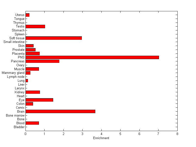 The expression level is normalized with tissue-library size. Each value for a gene in a tissue is a ratio of observed ESTs to the expected one in this tissue. The expected number of ESTs is the product of total ESTs of the gene and the fraction of total ESTs in the tissue among all ESTs in 30 tissues.