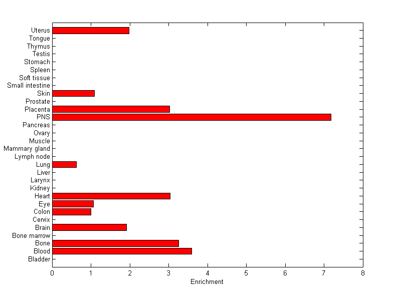 The expression level is normalized with tissue-library size. Each value for a gene in a tissue is a ratio of observed ESTs to the expected one in this tissue. The expected number of ESTs is the product of total ESTs of the gene and the fraction of total ESTs in the tissue among all ESTs in 30 tissues.