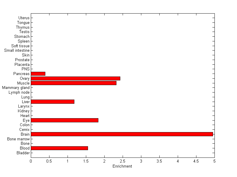 The expression level is normalized with tissue-library size. Each value for a gene in a tissue is a ratio of observed ESTs to the expected one in this tissue. The expected number of ESTs is the product of total ESTs of the gene and the fraction of total ESTs in the tissue among all ESTs in 30 tissues.