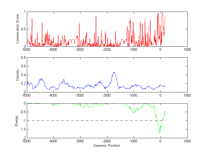 The energy profile (green curve) is about energy for module detection based on TF interaction. The positions with energy less than -1 indicate the existence of CRMs.