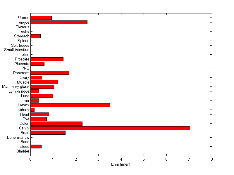 The expression level is normalized with tissue-library size. Each value for a gene in a tissue is a ratio of observed ESTs to the expected one in this tissue. The expected number of ESTs is the product of total ESTs of the gene and the fraction of total ESTs in the tissue among all ESTs in 30 tissues.