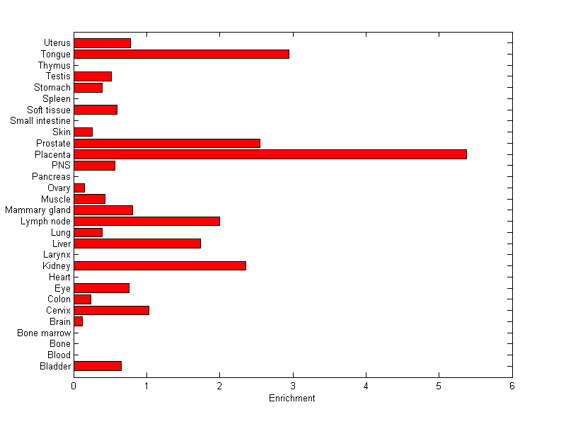 The expression level is normalized with tissue-library size. Each value for a gene in a tissue is a ratio of observed ESTs to the expected one in this tissue. The expected number of ESTs is the product of total ESTs of the gene and the fraction of total ESTs in the tissue among all ESTs in 30 tissues.