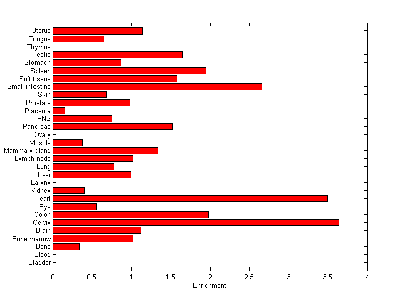 The expression level is normalized with tissue-library size. Each value for a gene in a tissue is a ratio of observed ESTs to the expected one in this tissue. The expected number of ESTs is the product of total ESTs of the gene and the fraction of total ESTs in the tissue among all ESTs in 30 tissues.