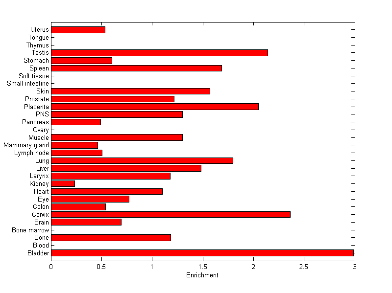 The expression level is normalized with tissue-library size. Each value for a gene in a tissue is a ratio of observed ESTs to the expected one in this tissue. The expected number of ESTs is the product of total ESTs of the gene and the fraction of total ESTs in the tissue among all ESTs in 30 tissues.