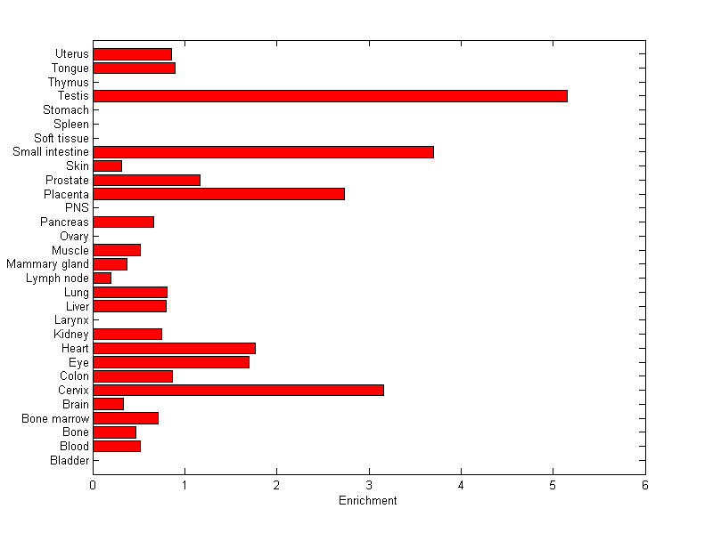 The expression level is normalized with tissue-library size. Each value for a gene in a tissue is a ratio of observed ESTs to the expected one in this tissue. The expected number of ESTs is the product of total ESTs of the gene and the fraction of total ESTs in the tissue among all ESTs in 30 tissues.