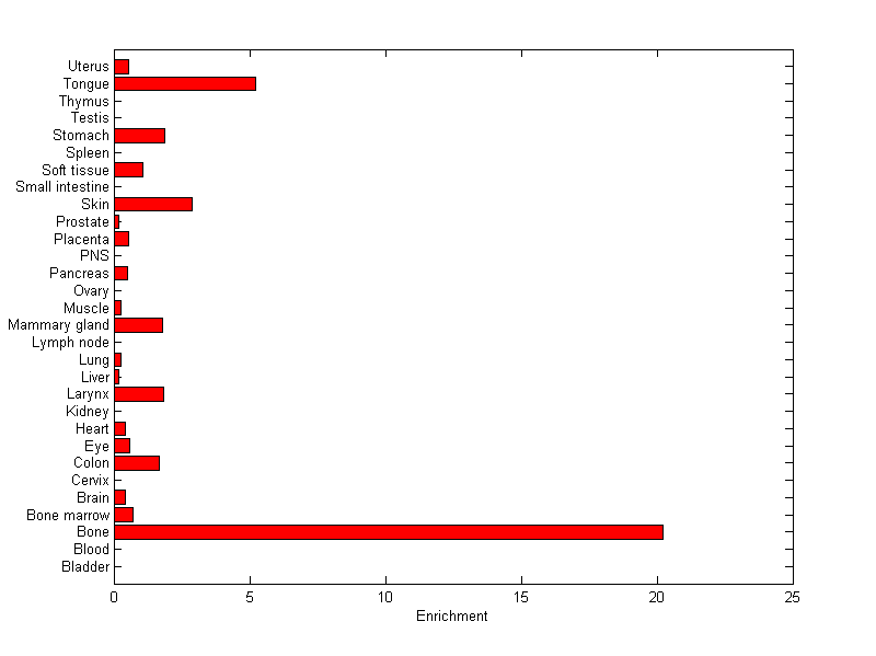 The expression level is normalized with tissue-library size. Each value for a gene in a tissue is a ratio of observed ESTs to the expected one in this tissue. The expected number of ESTs is the product of total ESTs of the gene and the fraction of total ESTs in the tissue among all ESTs in 30 tissues.