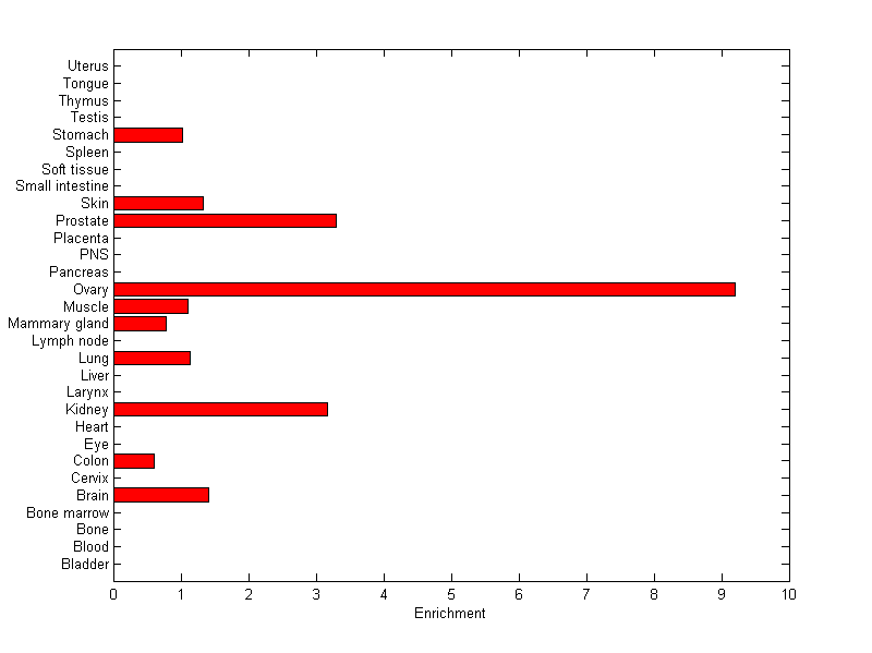 The expression level is normalized with tissue-library size. Each value for a gene in a tissue is a ratio of observed ESTs to the expected one in this tissue. The expected number of ESTs is the product of total ESTs of the gene and the fraction of total ESTs in the tissue among all ESTs in 30 tissues.