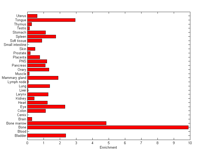 The expression level is normalized with tissue-library size. Each value for a gene in a tissue is a ratio of observed ESTs to the expected one in this tissue. The expected number of ESTs is the product of total ESTs of the gene and the fraction of total ESTs in the tissue among all ESTs in 30 tissues.