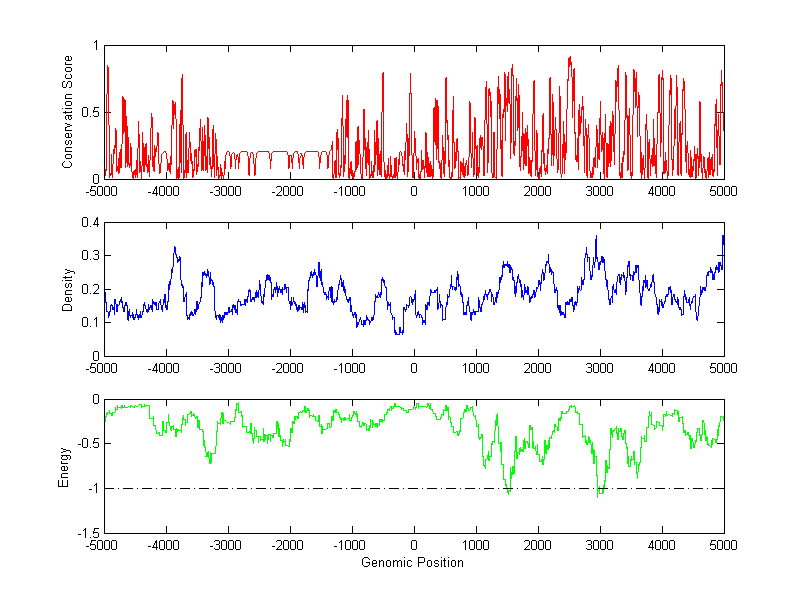 The energy profile (green curve) is about energy for module detection based on TF interaction. The positions with energy less than -1 indicate the existence of CRMs.