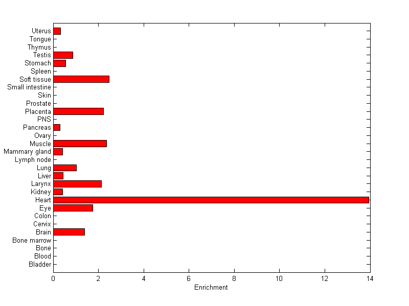 The expression level is normalized with tissue-library size. Each value for a gene in a tissue is a ratio of observed ESTs to the expected one in this tissue. The expected number of ESTs is the product of total ESTs of the gene and the fraction of total ESTs in the tissue among all ESTs in 30 tissues.