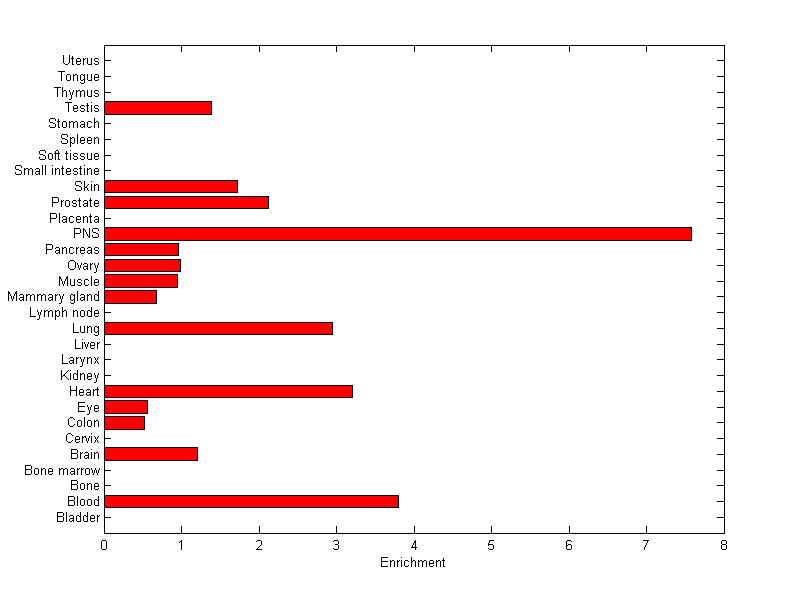 The expression level is normalized with tissue-library size. Each value for a gene in a tissue is a ratio of observed ESTs to the expected one in this tissue. The expected number of ESTs is the product of total ESTs of the gene and the fraction of total ESTs in the tissue among all ESTs in 30 tissues.