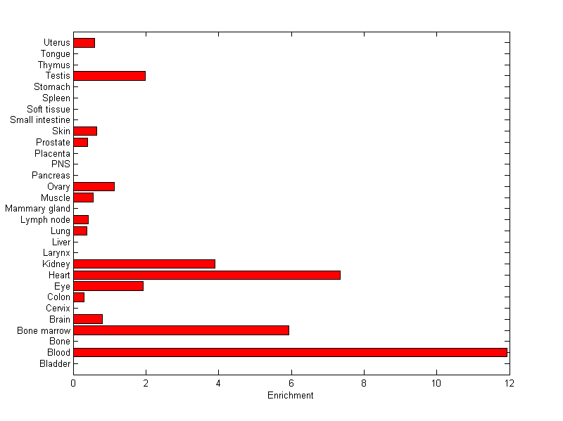 About the profile: The expression level is normalized with tissue-library size. Each value for a gene in a tissue is a ratio of observed ESTs to the expected one in this tissue. The expected number of ESTs is the product of total ESTs of the gene and the fraction of total ESTs in the tissue among all ESTs in 30 tissues. Summary: This gene is preferentially expressed in [blood, heart] Download: |