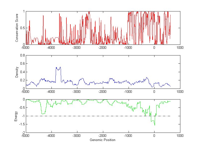The energy profile (green curve) is about energy for module detection based on TF interaction. The positions with energy less than -1 indicate the existence of CRMs.