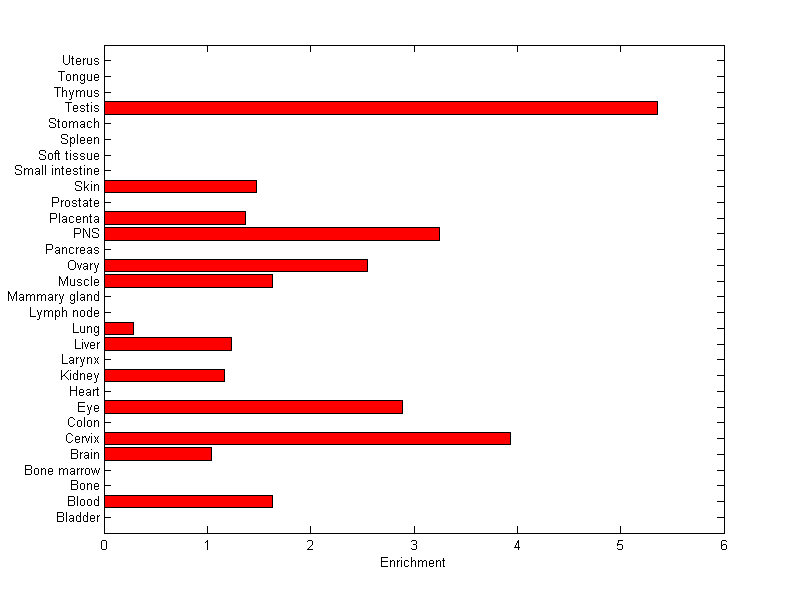 The expression level is normalized with tissue-library size. Each value for a gene in a tissue is a ratio of observed ESTs to the expected one in this tissue. The expected number of ESTs is the product of total ESTs of the gene and the fraction of total ESTs in the tissue among all ESTs in 30 tissues.