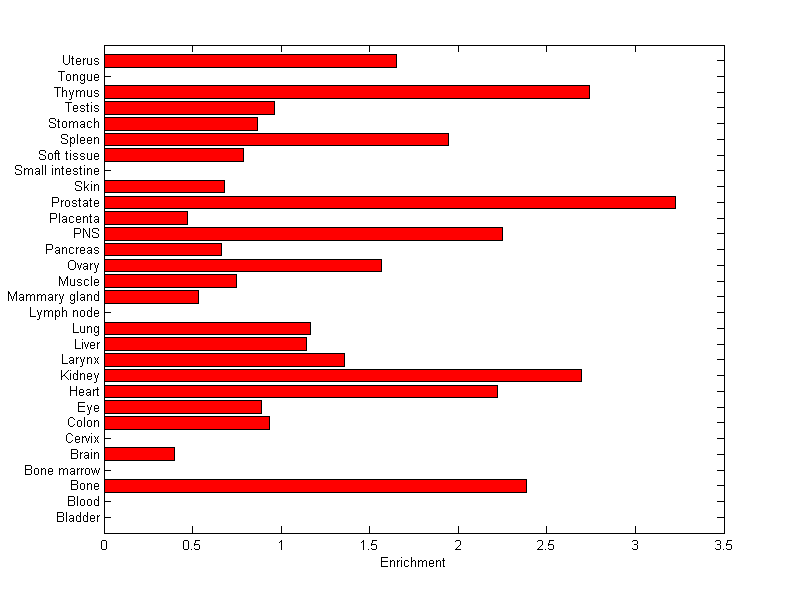 The expression level is normalized with tissue-library size. Each value for a gene in a tissue is a ratio of observed ESTs to the expected one in this tissue. The expected number of ESTs is the product of total ESTs of the gene and the fraction of total ESTs in the tissue among all ESTs in 30 tissues.