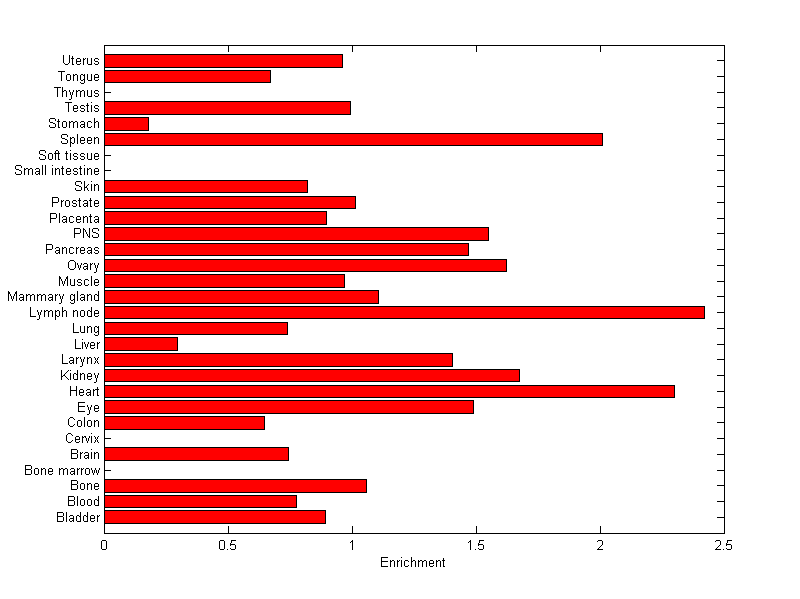 The expression level is normalized with tissue-library size. Each value for a gene in a tissue is a ratio of observed ESTs to the expected one in this tissue. The expected number of ESTs is the product of total ESTs of the gene and the fraction of total ESTs in the tissue among all ESTs in 30 tissues.