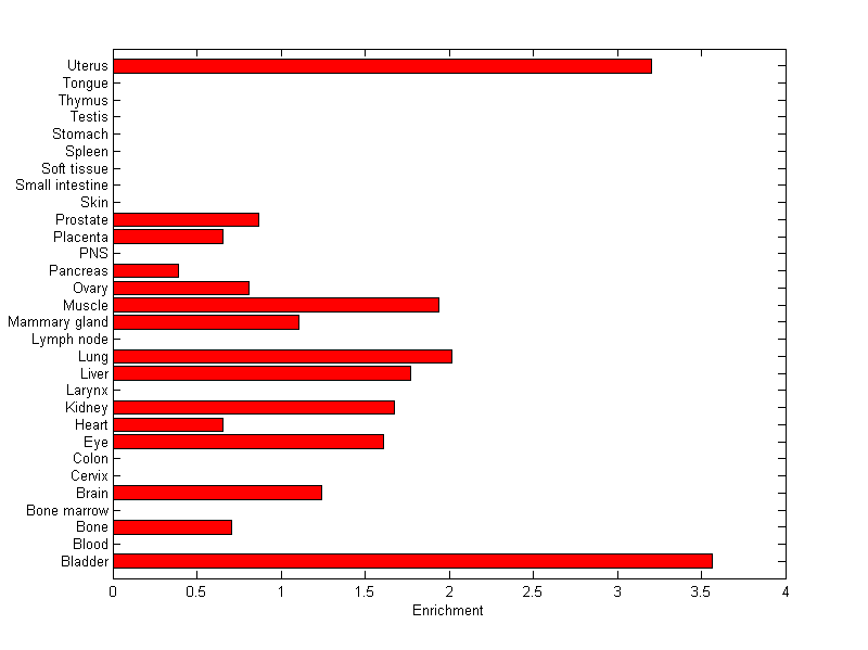 The expression level is normalized with tissue-library size. Each value for a gene in a tissue is a ratio of observed ESTs to the expected one in this tissue. The expected number of ESTs is the product of total ESTs of the gene and the fraction of total ESTs in the tissue among all ESTs in 30 tissues.