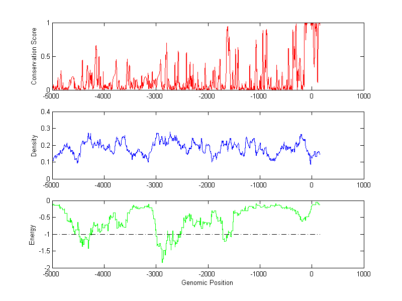 The energy profile (green curve) is about energy for module detection based on TF interaction. The positions with energy less than -1 indicate the existence of CRMs.