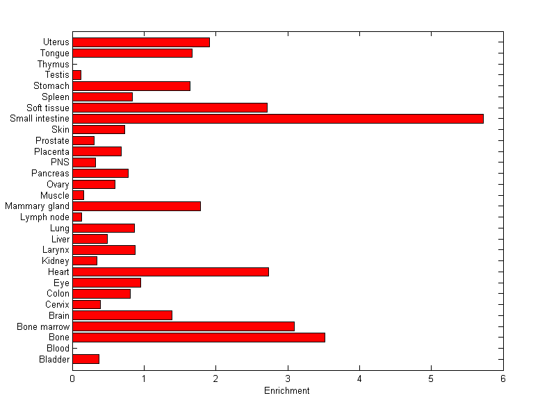 The expression level is normalized with tissue-library size. Each value for a gene in a tissue is a ratio of observed ESTs to the expected one in this tissue. The expected number of ESTs is the product of total ESTs of the gene and the fraction of total ESTs in the tissue among all ESTs in 30 tissues.