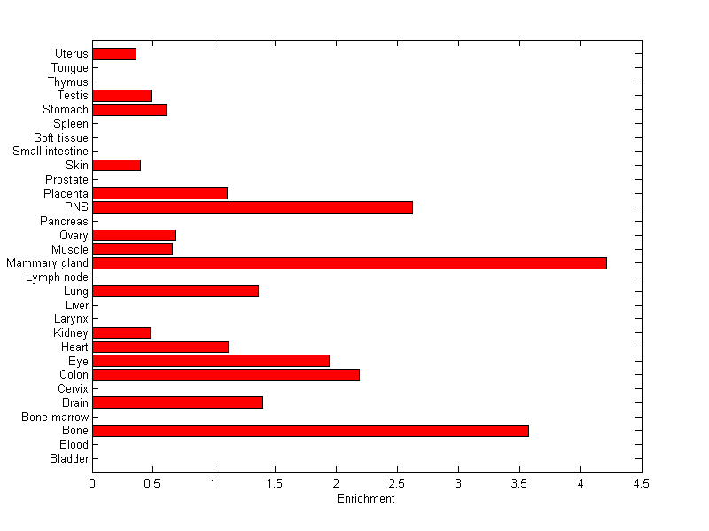 The expression level is normalized with tissue-library size. Each value for a gene in a tissue is a ratio of observed ESTs to the expected one in this tissue. The expected number of ESTs is the product of total ESTs of the gene and the fraction of total ESTs in the tissue among all ESTs in 30 tissues.