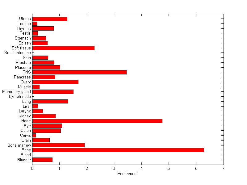 The expression level is normalized with tissue-library size. Each value for a gene in a tissue is a ratio of observed ESTs to the expected one in this tissue. The expected number of ESTs is the product of total ESTs of the gene and the fraction of total ESTs in the tissue among all ESTs in 30 tissues.