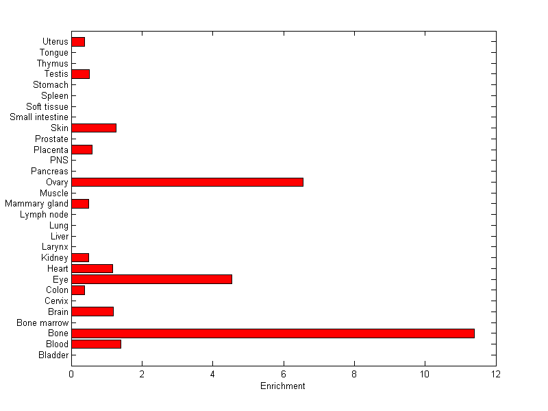 About the profile: The expression level is normalized with tissue-library size. Each value for a gene in a tissue is a ratio of observed ESTs to the expected one in this tissue. The expected number of ESTs is the product of total ESTs of the gene and the fraction of total ESTs in the tissue among all ESTs in 30 tissues. Summary: This gene is preferentially expressed in [bone, ovary] Download: |