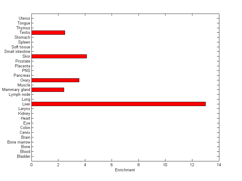 The expression level is normalized with tissue-library size. Each value for a gene in a tissue is a ratio of observed ESTs to the expected one in this tissue. The expected number of ESTs is the product of total ESTs of the gene and the fraction of total ESTs in the tissue among all ESTs in 30 tissues.