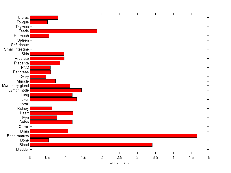 The expression level is normalized with tissue-library size. Each value for a gene in a tissue is a ratio of observed ESTs to the expected one in this tissue. The expected number of ESTs is the product of total ESTs of the gene and the fraction of total ESTs in the tissue among all ESTs in 30 tissues.
