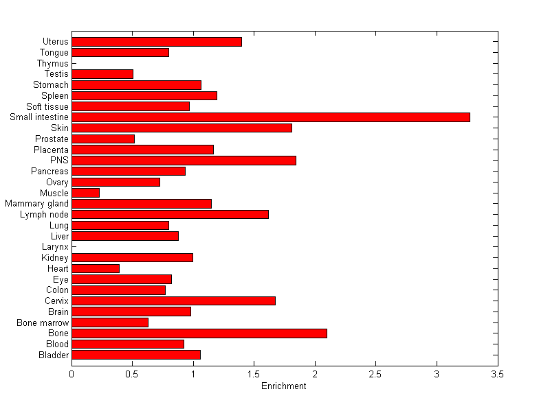 The expression level is normalized with tissue-library size. Each value for a gene in a tissue is a ratio of observed ESTs to the expected one in this tissue. The expected number of ESTs is the product of total ESTs of the gene and the fraction of total ESTs in the tissue among all ESTs in 30 tissues.