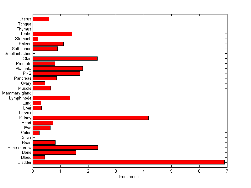 The expression level is normalized with tissue-library size. Each value for a gene in a tissue is a ratio of observed ESTs to the expected one in this tissue. The expected number of ESTs is the product of total ESTs of the gene and the fraction of total ESTs in the tissue among all ESTs in 30 tissues.