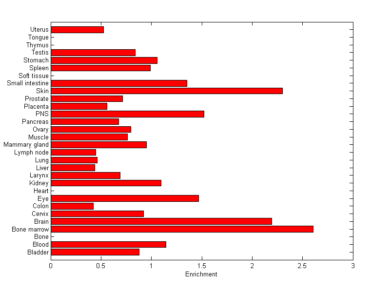 The expression level is normalized with tissue-library size. Each value for a gene in a tissue is a ratio of observed ESTs to the expected one in this tissue. The expected number of ESTs is the product of total ESTs of the gene and the fraction of total ESTs in the tissue among all ESTs in 30 tissues.