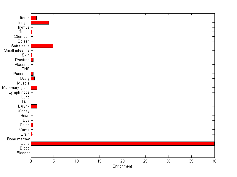 The expression level is normalized with tissue-library size. Each value for a gene in a tissue is a ratio of observed ESTs to the expected one in this tissue. The expected number of ESTs is the product of total ESTs of the gene and the fraction of total ESTs in the tissue among all ESTs in 30 tissues.