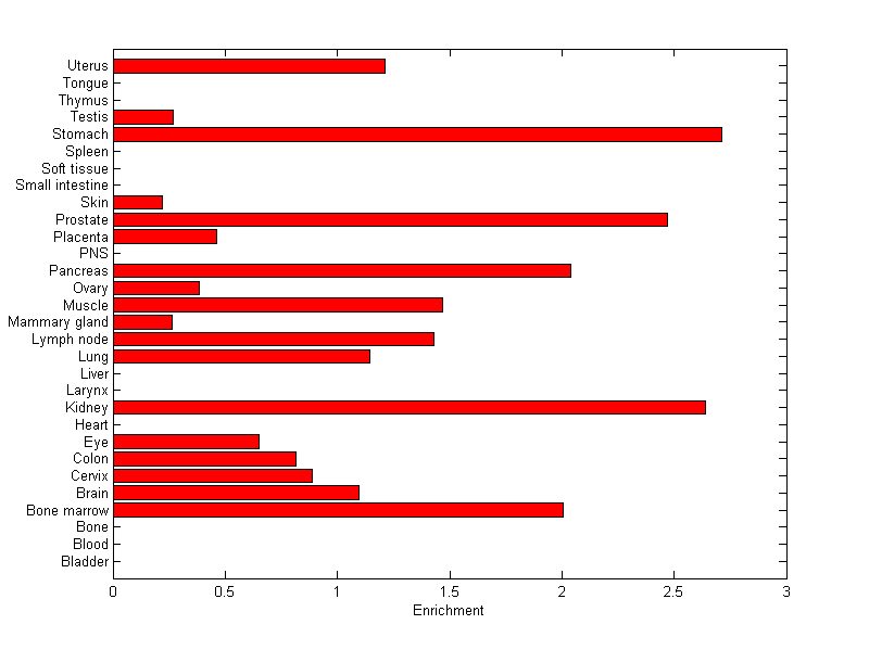 The expression level is normalized with tissue-library size. Each value for a gene in a tissue is a ratio of observed ESTs to the expected one in this tissue. The expected number of ESTs is the product of total ESTs of the gene and the fraction of total ESTs in the tissue among all ESTs in 30 tissues.