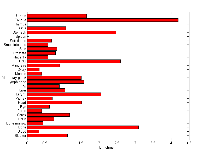 The expression level is normalized with tissue-library size. Each value for a gene in a tissue is a ratio of observed ESTs to the expected one in this tissue. The expected number of ESTs is the product of total ESTs of the gene and the fraction of total ESTs in the tissue among all ESTs in 30 tissues.