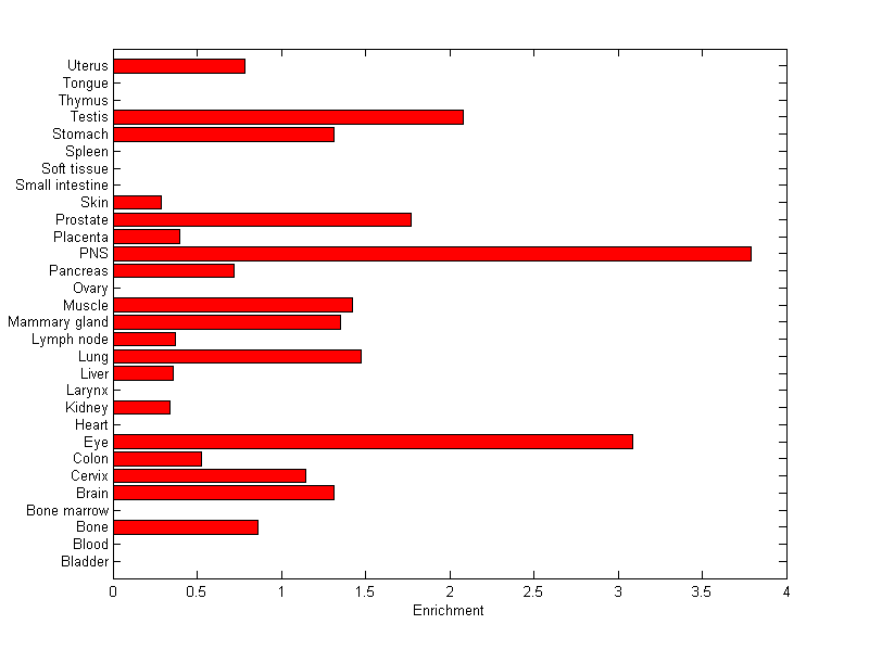 The expression level is normalized with tissue-library size. Each value for a gene in a tissue is a ratio of observed ESTs to the expected one in this tissue. The expected number of ESTs is the product of total ESTs of the gene and the fraction of total ESTs in the tissue among all ESTs in 30 tissues.