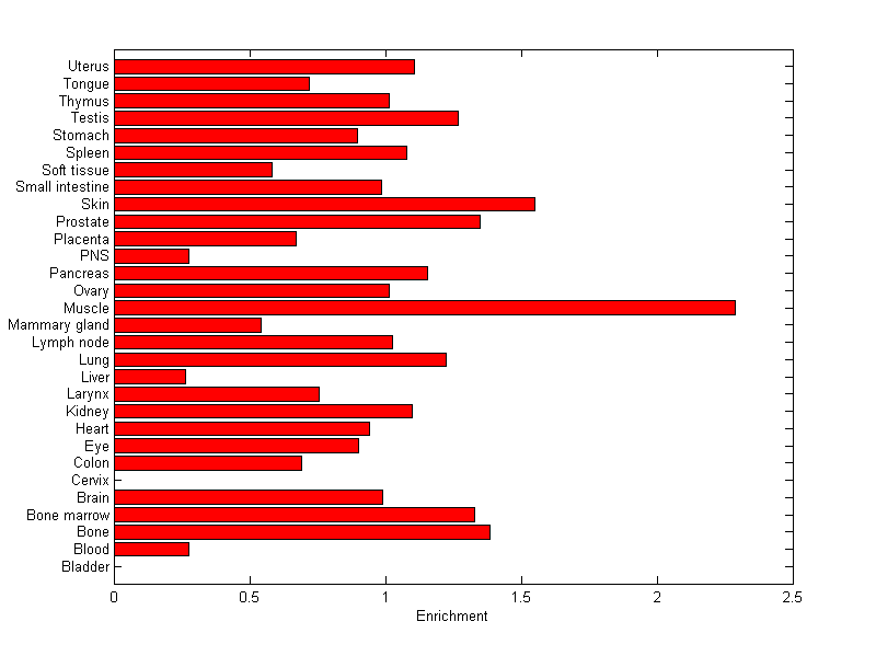 The expression level is normalized with tissue-library size. Each value for a gene in a tissue is a ratio of observed ESTs to the expected one in this tissue. The expected number of ESTs is the product of total ESTs of the gene and the fraction of total ESTs in the tissue among all ESTs in 30 tissues.