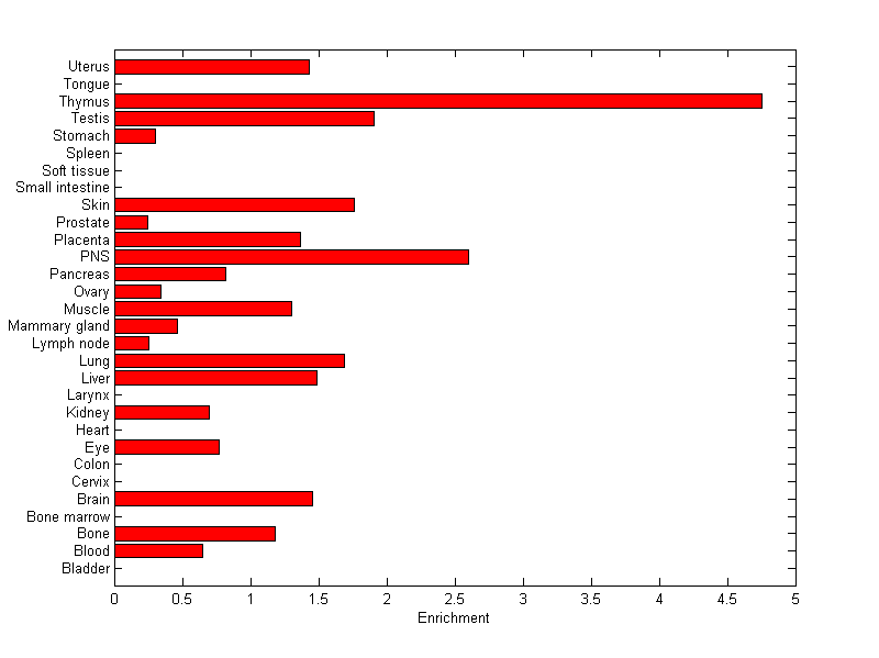 The expression level is normalized with tissue-library size. Each value for a gene in a tissue is a ratio of observed ESTs to the expected one in this tissue. The expected number of ESTs is the product of total ESTs of the gene and the fraction of total ESTs in the tissue among all ESTs in 30 tissues.