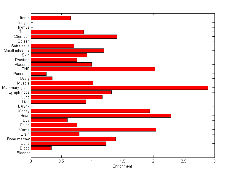 The expression level is normalized with tissue-library size. Each value for a gene in a tissue is a ratio of observed ESTs to the expected one in this tissue. The expected number of ESTs is the product of total ESTs of the gene and the fraction of total ESTs in the tissue among all ESTs in 30 tissues.