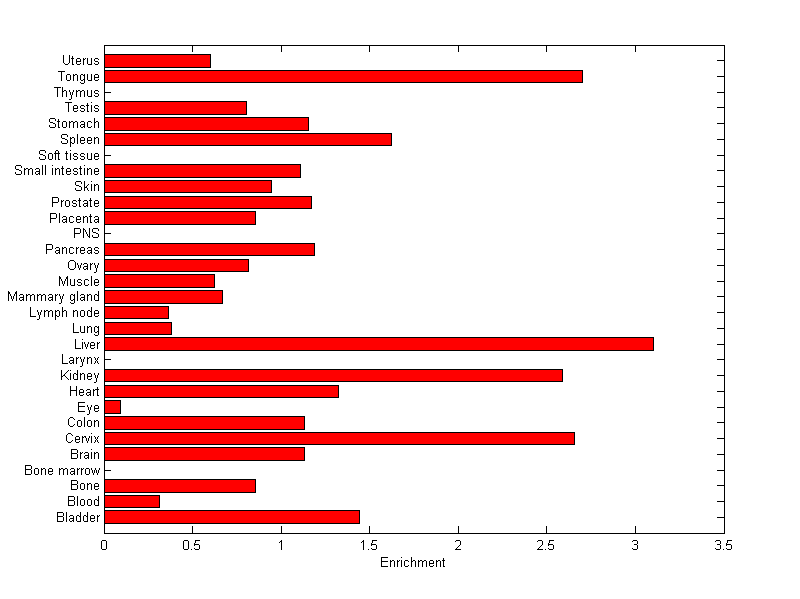 The expression level is normalized with tissue-library size. Each value for a gene in a tissue is a ratio of observed ESTs to the expected one in this tissue. The expected number of ESTs is the product of total ESTs of the gene and the fraction of total ESTs in the tissue among all ESTs in 30 tissues.